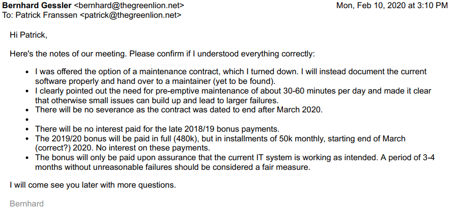 Now he starts a tirade of attacks on my work and gets loud. I know that the finances had played a big role in letting me go and Antonia had confirmed that right on December 23rd, but now he claims it was never about the money at all and only about my work. He goes on and on about why my work was bad and unnecessary. He blames me for working too detailed and too exact. He says some things should not be connected and rather be done informally. He gives the following example: “Suppose we wanted to evade taxes, than having all finances in one accounting system would not be good.”. Interesting that this is the first example that he comes up with, yet not that surprising once you consider that in 2017 The Green Lion West made about 2 Million Euros revenue, 0.5 Million Euros Profit and paid about 1000 Euros corporate taxes due to creative accounting.