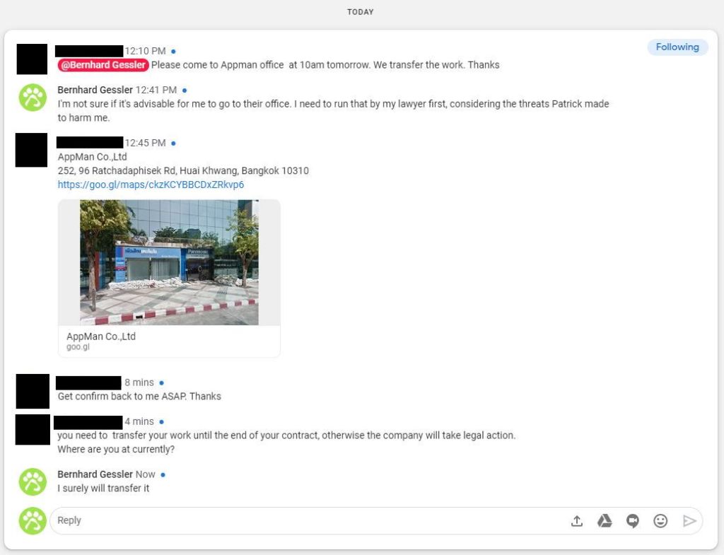 Antonia messages me and asks me to meet the day after at the Appman office (Emile’s company) to hand over my work. Otherwise she threatens legal consequences. This comes from Patrick as she later on confirms.